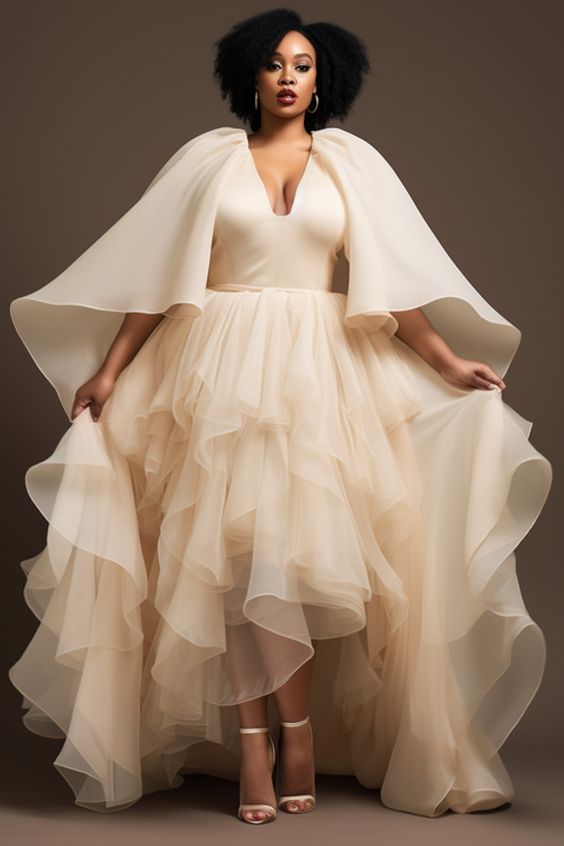 Picture a gown that cascades like liquid gold, its ruffled layers descending in a waterfall of soft tulle. The bodice hugs in all the right places, promising a silhouette that celebrates curves. The sweeping cape sleeves add a dramatic flair, perfect for the bride who commands presence. This champagne gown redefines opulence, inviting a regal air to any wedding procession.