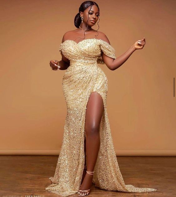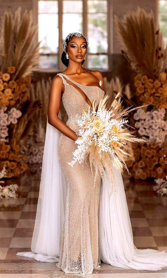 This dress, with its bold structural design and ornate embellishments, is for the bride who is unafraid to make a statement. The blend of traditional sequins with modern cuts embodies a champagne wedding dress that is anything but ordinary. It is a testament to a black woman’s classy, indomitable spirit.