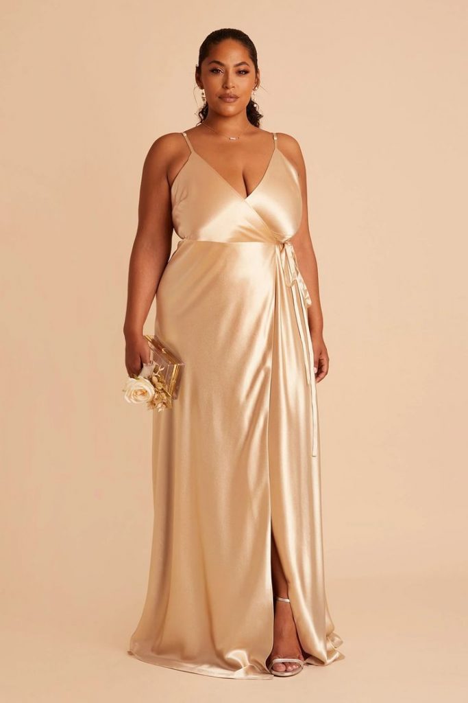 As the golden hour casts its warm glow, this satin champagne dress mirrors the sky’s natural beauty. With a flattering V-neck and a wrap-around tie waist, it embodies the laid-back yet sophisticated vibe of a beach wedding or an intimate evening affair.