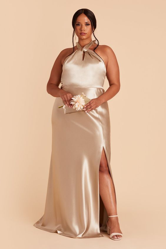 Minimalism meets luxury in this satin sheath dress. The halter neck and sleek lines speak to the bride with a penchant for understated beauty. The thigh-high slit is a tasteful touch that allows for movement, making it ideal for a summer wedding or a chic party. This dress, devoid of excessive ornamentation, shows that sometimes, less is indeed more.