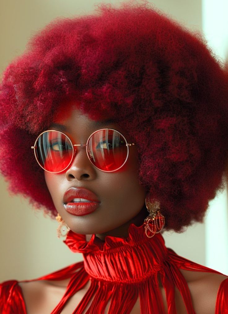 This bold and striking red afro is perfect for those who want to stand out this Christmas. The vibrant red hue combined with the large, fluffy texture makes this hairstyle a statement in itself. Paired with fashionable sunglasses and a chic outfit, this look is perfect for any holiday event where you want to make a dramatic impression.
