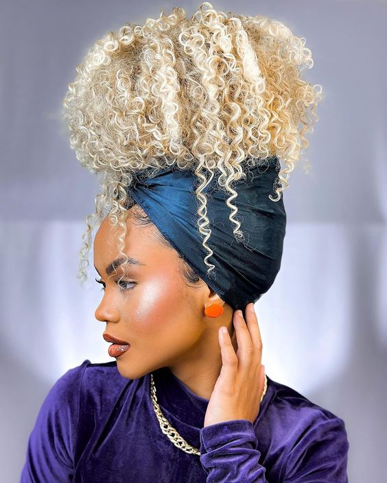 A platinum blonde puff wrapped in a stylish headwrap is a beautiful choice for Christmas. The curly puff sits high on the head, adding volume and drawing attention to the face, while the headwrap offers a chic and protective element to the look. The contrast between the blonde curls and the dark wrap creates a striking visual effect, making this style perfect for holiday parties or casual family gatherings.