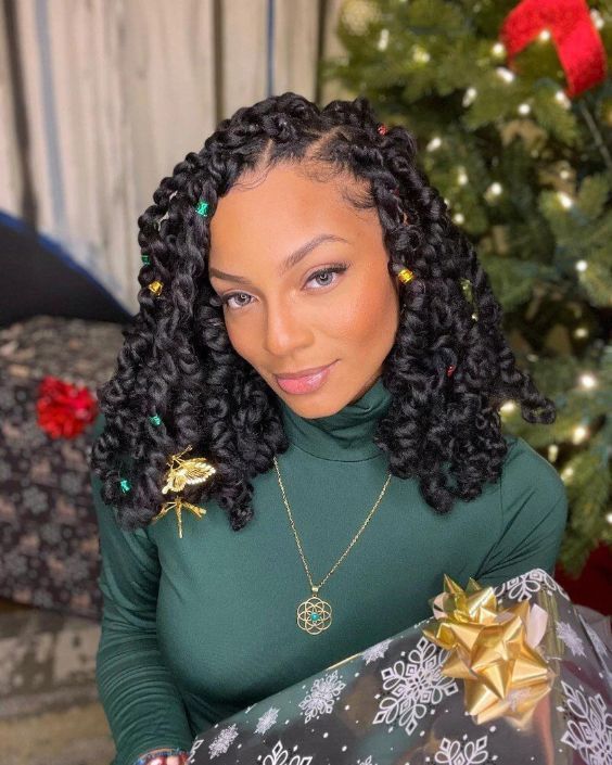 These crochet twists are decorated with holiday-themed accessories, such as tiny beads and charms, making them a beautiful choice for Christmas. The shoulder-length style is easy to wear, and the curls add just the right amount of volume. The versatility of crochet twists means you can style them in various ways, but they look fantastic as is, making this an excellent option for both Christmas Eve dinners and laid-back family gatherings.