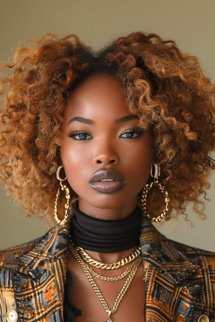 This golden blonde fro is all about embracing texture and color for the holidays. The blonde hues contrast beautifully against darker skin tones, making this a striking choice for women who want to make a statement. Perfect for Christmas parties, this style exudes confidence and holiday cheer.