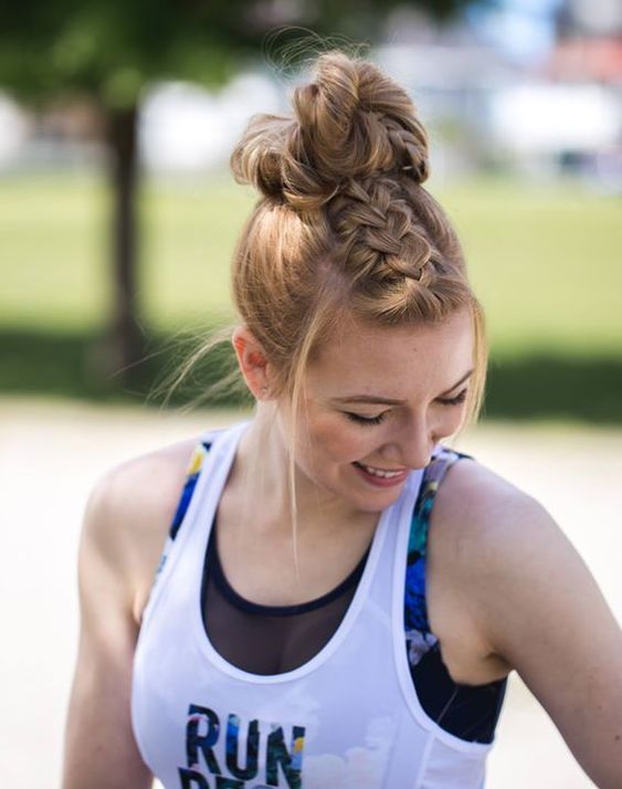 This youthful and playful hairstyle is perfect for those who like to add a fun twist to their gym look. The style features two top knots at the crown of the head, with parts of the hair braided before being twisted into buns. This not only adds a creative flair to the look but also ensures that your hair stays in place no matter how vigorous the exercise.
