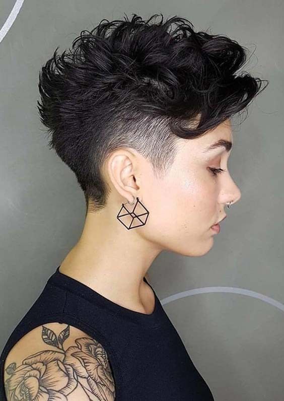 This curly pixie showcases a subtle taper with a creative shaved design along the side, adding texture and flair. Perfect for naturally curly hair, it combines softness with an edgy twist, making it a stylish choice for a fun, personalized look.