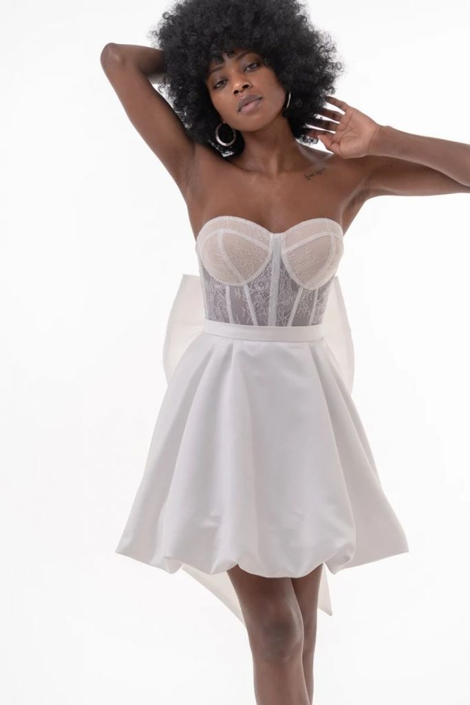 Last but not least, the lace bustier mini dress is the epitome of classy and sexy. The delicate lace detailing adds a layer of allure without detracting from the dress’s sophisticated silhouette. It’s an ideal choice for the bride looking for a short white wedding dress black woman 2024 that is as unforgettable as her own story.