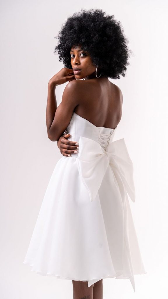 A classic with a twist, this bow-back dress marries tradition with modernity. The large bow detail offers a stunning surprise from behind, a nod to the unexpected elements that make a wedding memorable. It’s perfect for the black bride who holds dear the time-honored aspects of a wedding but isn’t afraid to infuse her personality.
