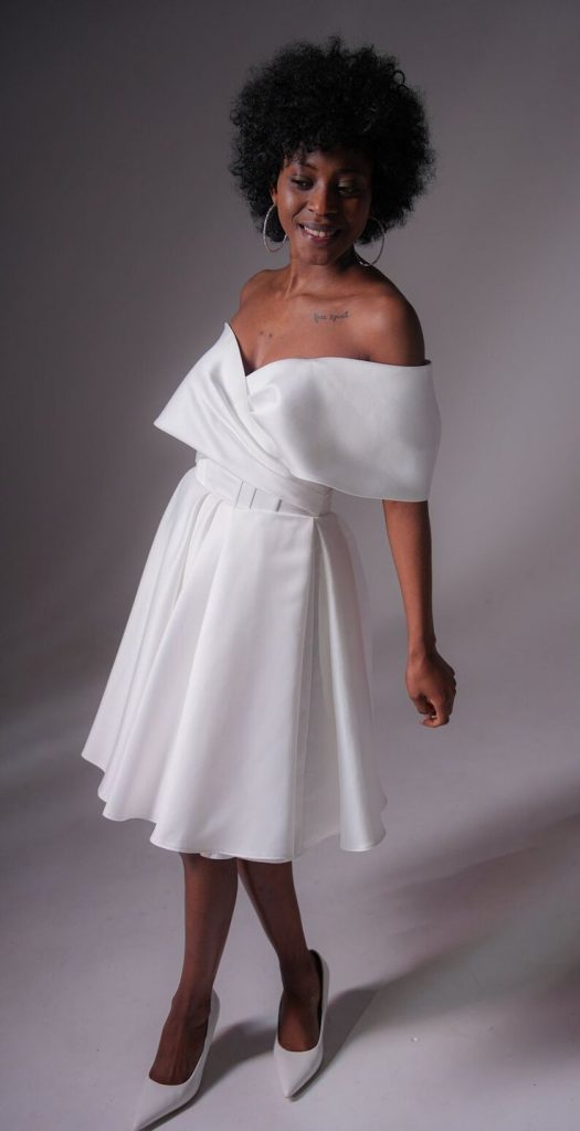 Charm and personality come together in this textured dress. The floral embellishments add depth and playfulness to the classic short white wedding dress. It’s a versatile piece that can go from a graduation ceremony to walking down the aisle, perfectly fitting for a black woman who adores multitasking her wardrobe.
