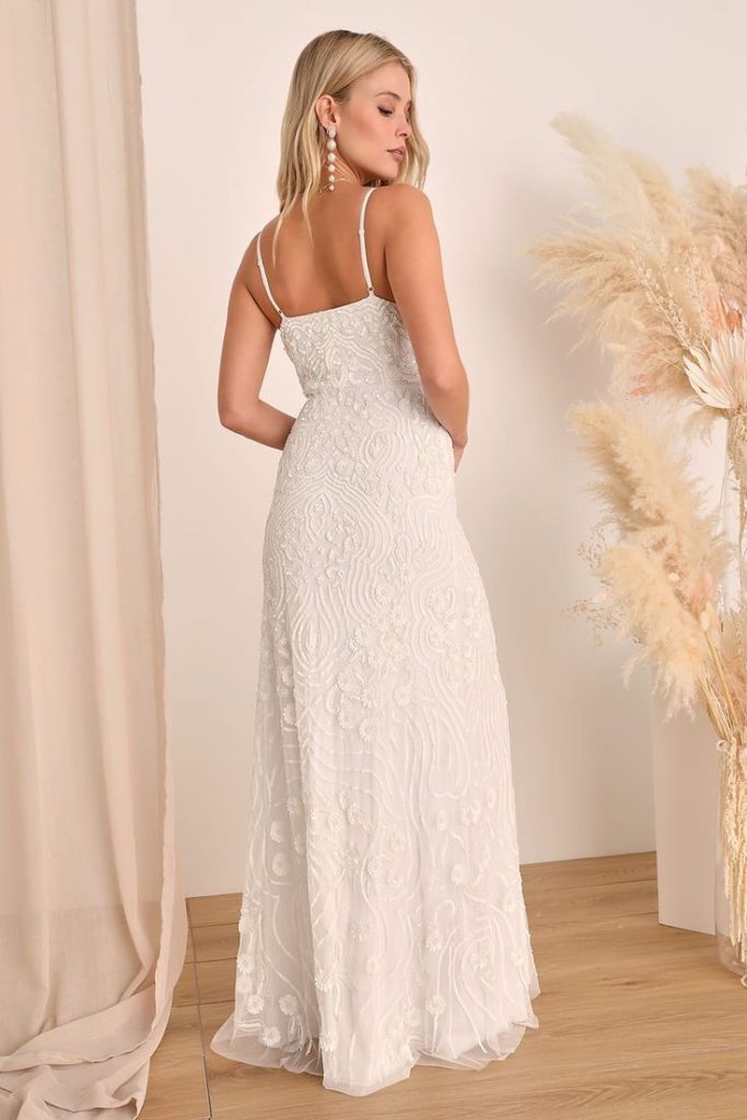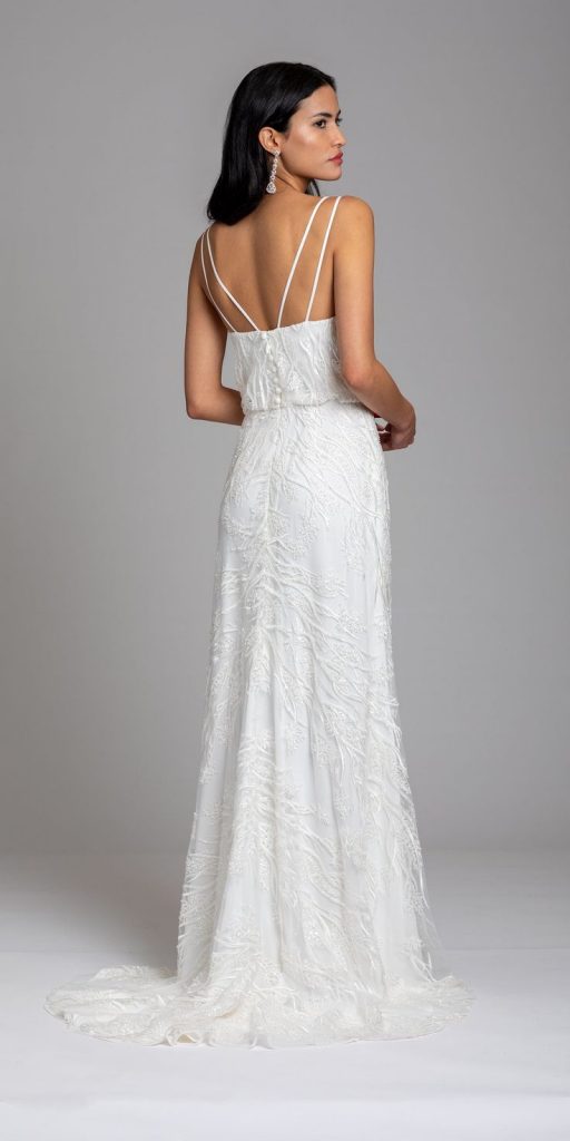 There’s something profoundly peaceful about a dress that speaks volumes without saying much. This gown, with its understated lace patterns and delicate straps crossing over an open back, exudes serenity. It’s for the bride who moves with grace and believes in the power of quiet elegance—a true testament to boho wedding dress 2024 fashion.