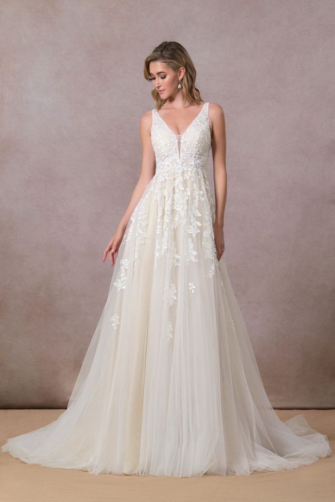 The embodiment of a fairytale dream, this A-line dress flows like a gentle stream, making it a go-to for those craving flowy elegance. The sheer overlay and floral appliqués speak directly to the boho bride’s soul, evoking a sense of carefree charm.