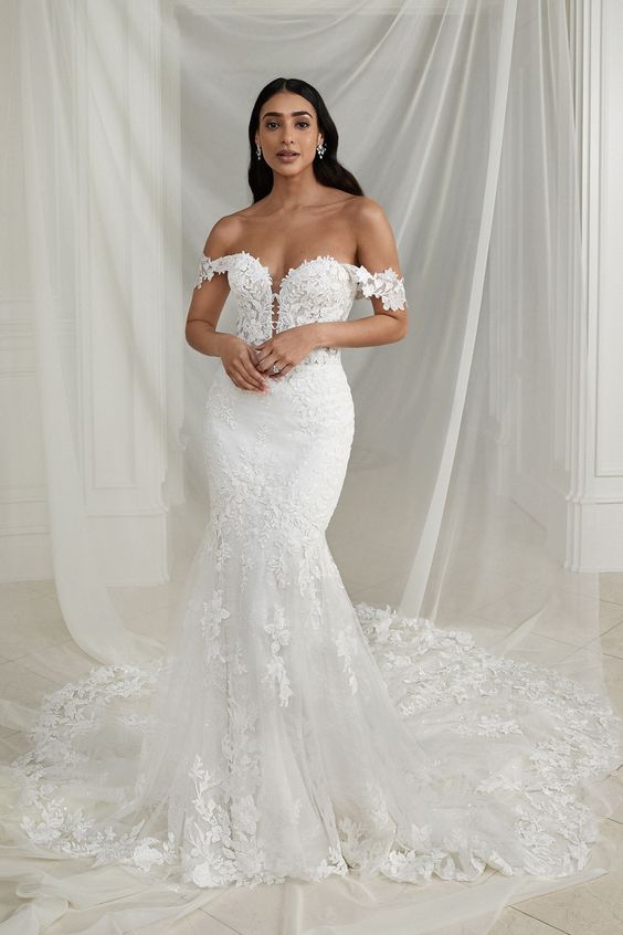 With a nod to timeless style, this off-shoulder lace gown is for the bride who adores classic beauty with a twist of elegance. It hugs the curves in all the right places, ensuring the bride feels nothing short of regal on her special day.
