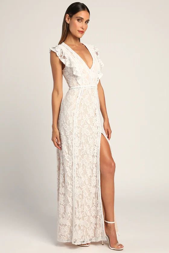 Channeling the relaxed essence of boho spirit, this dress with its deep V-neckline and fluttering lace cap sleeves offers a casual yet captivating choice. The front slit is a nod to the bride who dares to be different while maintaining a simple and elegant aura.