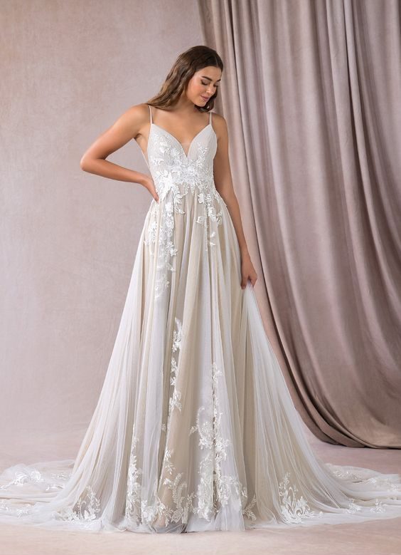 As if designed by the hands of fairy godmothers, this dress features intricate embroidery that seems to dance upon a canvas of sheer fabric. It’s perfect for the bride who carries a sense of elegance and enchantment in her very essence. The subtle hues bring a touch of warmth, ideal for a sunset wedding by the shore or a rustic affair amidst the woods.