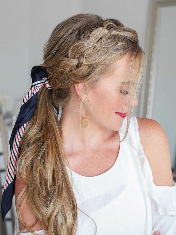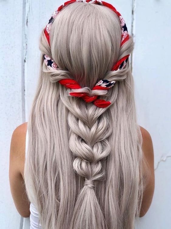 Picture a classic hairstyle with a modern patriotic twist – a sleek braid adorned with a bandana featuring the stars and stripes. This 4th of July hairstyle for women with long hair is not just a nod to the festivities but also exudes a timeless charm. Perfect for a family barbecue or an evening of fireworks, this style is easy to achieve yet makes a bold statement.