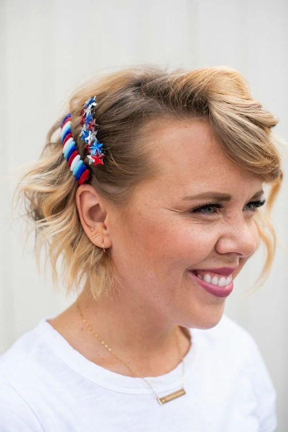 Who says short hair can’t make a big impact? Spike it up with some blue and red hair gel, or slick it back with star-shaped clips. The Fourth of July is the perfect excuse to experiment and showcase the power of a bold pixie or a sleek bob.
