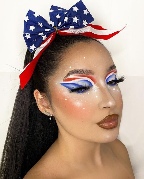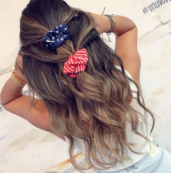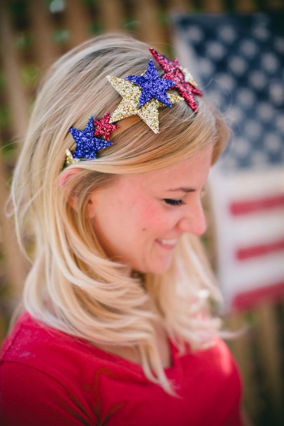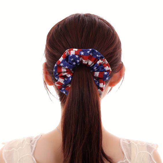 Create a high ponytail and use colored hair ties in red, white, and blue to segment the tail. Wrap each section with a different color to mimic the American flag’s stripes. It’s an easy, fun look that adds a pop of patriotism to your outfit.