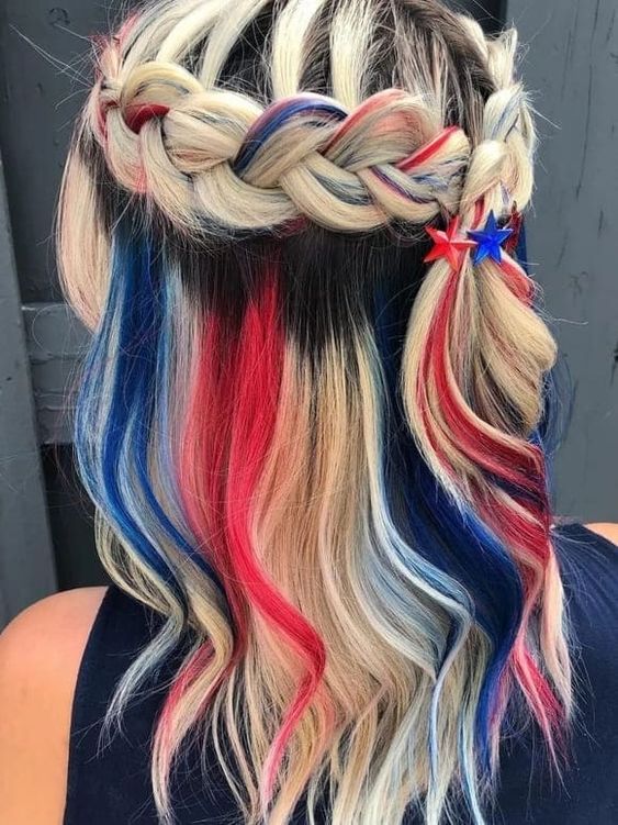 A halo braid with twists of red, white, and blue extensions woven through offers a heavenly look that’s both patriotic and chic. This style suits medium to long hair and works well for any 4th of July gathering, providing a sophisticated yet festive appearance.