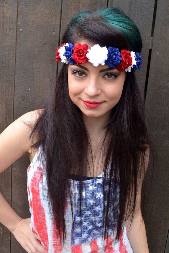 For those who appreciate a bohemian touch, consider a flower crown in red, white, and blue. This 4th of July hairstyle for women with medium to long hair is effortlessly chic and can be paired with a simple sundress for a laid-back holiday look. The floral accents evoke the beauty of summer while paying homage to the nation’s colors.