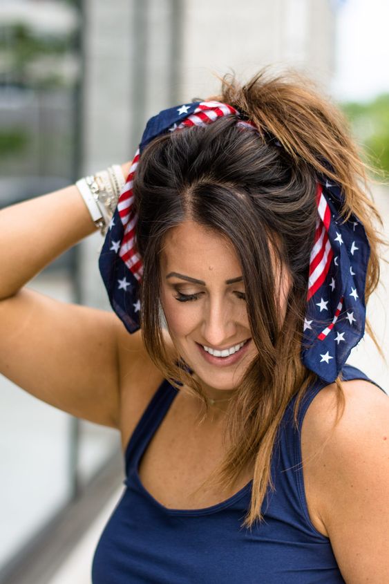 A casual yet stylish option is the bandana bun, a perfect blend of comfort and trend. This easy 4th of July hairstyle for women is ideal for those who plan to enjoy the holiday activities without fuss. Simply tie your curly or straight hair into a high bun and wrap a patriotic bandana around it for an instant celebration-ready look.