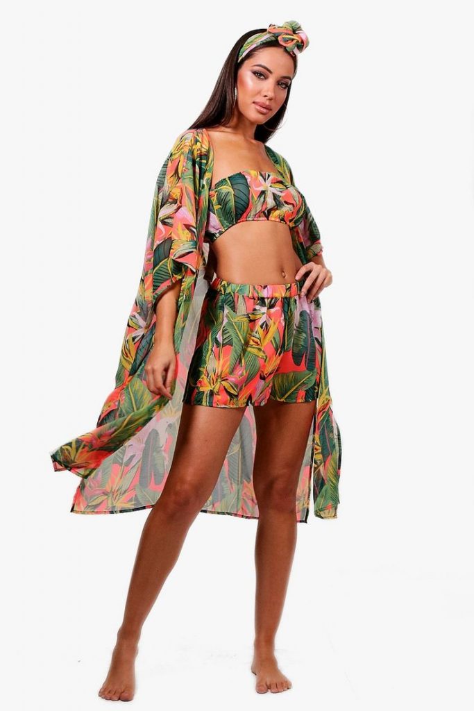 Florals? For the beach? Groundbreaking. This outfit features a geometric floral bikini paired with a floaty kimono—perfect for those who love a bold, floral frenzy. It’s a splendid choice for beach trip outfits tropical with an edge.