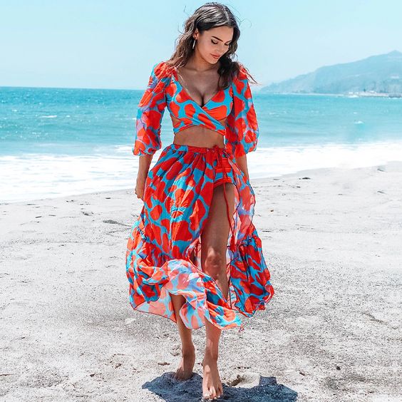 Evoking the vibrant hues of coral reefs, this wrap dress ensemble with a daring bikini top is a masterpiece of beach trip outfits 2024. It’s a standout choice for a beach trip outfits vacation, ensuring you flow with the grace of the ocean itself.