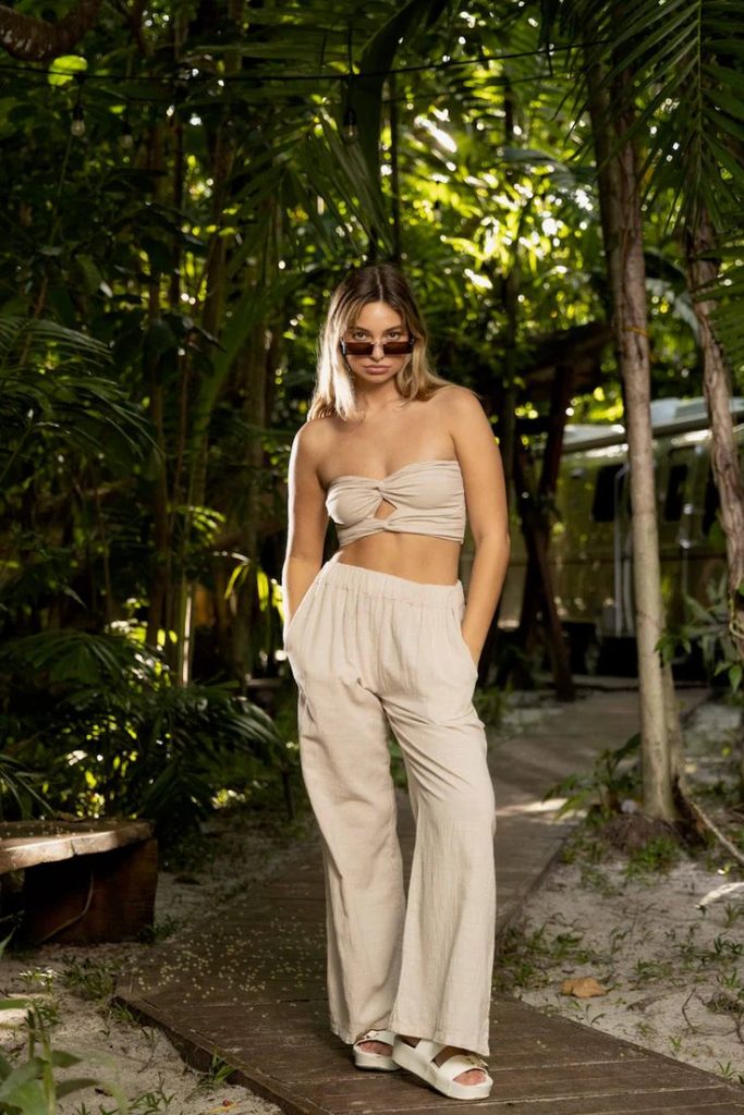 Tropical prints are the quintessence of beach attire, and this outfit is no exception. A strapless, knotted bandeau top with high-waisted trousers in neutral shades sets the stage for a versatile beach look. Add sunglasses and you’re ready for a tropical adventure, marking it as a staple for beach trip outfits tropical.
