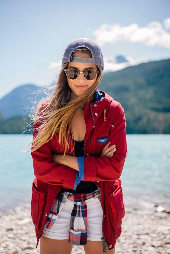Perched by a serene mountain lake, this outfit screams summer casual. It’s a perfect blend of functionality and fashion for those cool, high-altitude mornings. The red jacket with a distinctive outdoor brand patch offers warmth, while the shorts provide freedom of movement. The cap and round sunglasses add a touch of modern flair, reminding us that even in the wilderness, style has a place.