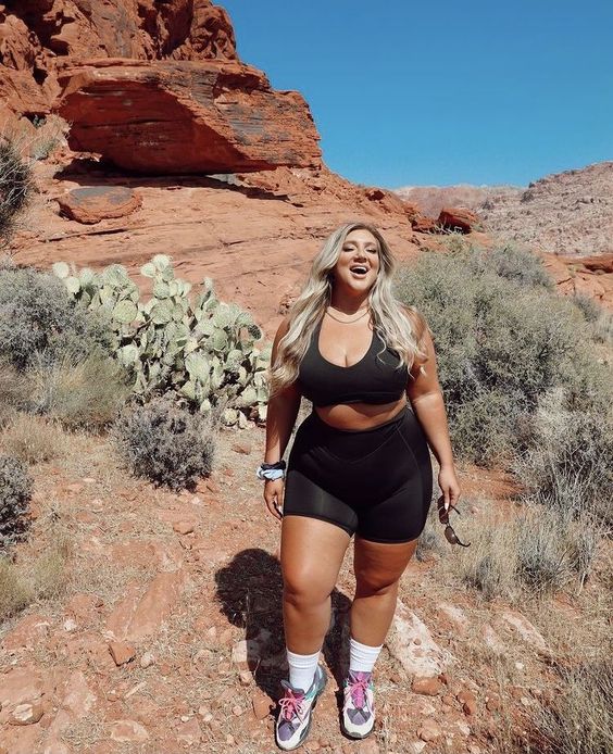 Imagine hitting the trails under a sun-soaked sky. For this, a sleek, high-waisted black biker shorts paired with a matching sports bra and a cap is the epitome of a camping outfit for women summer hiking. The outfit is not only breathable and supportive for those strenuous hikes but also nods to the athleisure trend that continues to reign.