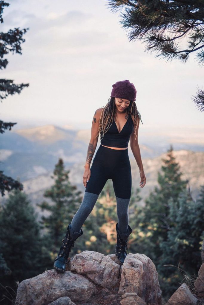 As the leaves turn, your camping wardrobe can also transition. A black crop top paired with a cozy beanie and grey leggings embodies the camping outfits for women fall theme. It offers both warmth and flexibility, perfect for those crisp autumn hikes.