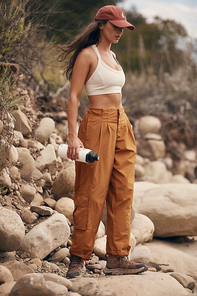 For the woman who takes on rugged terrains, a pair of mustard cargo pants with a white sports bra and a cap signifies a camping outfit for women summer that’s ready for action. It balances functionality with a subtle nod to the military-inspired fashion, ensuring you’re equipped for any challenge.