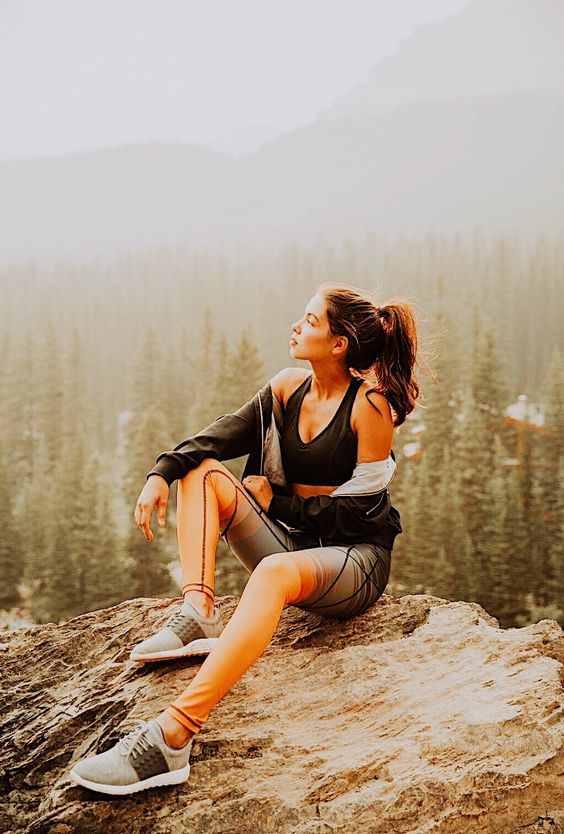 Capturing the essence of a camping outfit for women autumn, a monochrome ensemble with a dash of burnt orange leggings blends perfectly with the warm hues of a mountain sunset. This look is not only Instagram-worthy but also offers comfort as you unwind after a day of adventure.