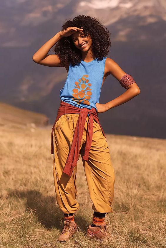 Stride with confidence across the mountain meadows in this delightful ensemble that’s a tapestry of color and comfort. This look is a celebration of fall casual with its layered tank top and earth-toned cargo pants tied with a sweater. The hiking boots are just the ticket for a romp through nature.