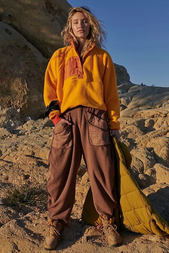 Command the rocky terrain in this autumn outfit that perfectly balances style and ruggedness. The striking orange cargo pants are paired with a neutral tank top, accentuating a look that’s as earthy as it is practical. The high-top boots are not just on-trend, they’re a nod to the necessity of sturdy footwear when out in the wild.