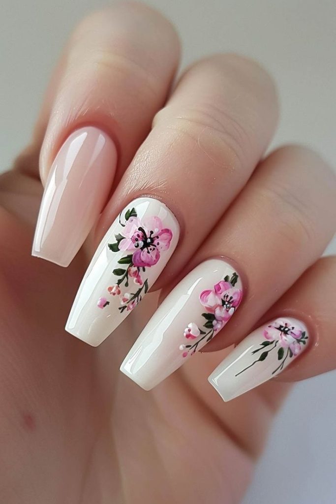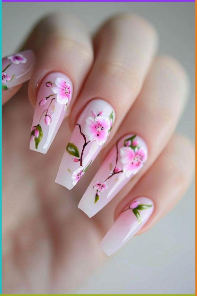 This design embodies the beauty of spring with its pink-tinted base and lush floral detailing. The flowers are painted in a mix of light pink and green accents, creating a vivid yet delicate composition. The long acrylic nails add sophistication while maintaining a playful edge.