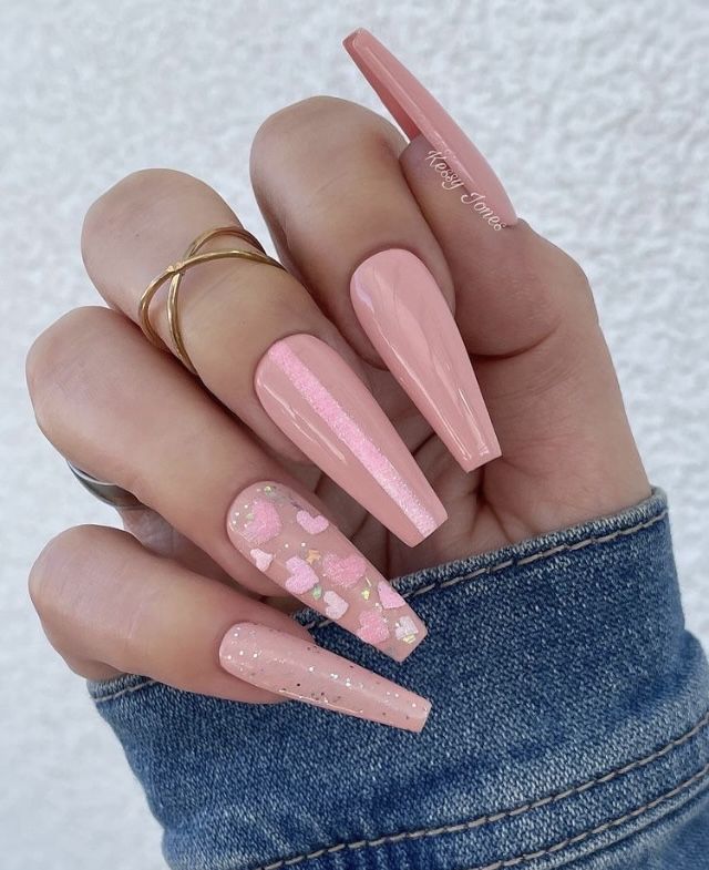 If you love a combination of soft pinks and shimmering accents, this fun design is for you. Featuring solid pink nails paired with glitter-encrusted accents and heart-shaped patterns, this look is ideal for those who enjoy a playful yet classy style. The subtle sparkle adds depth, while the coffin shape keeps it modern.