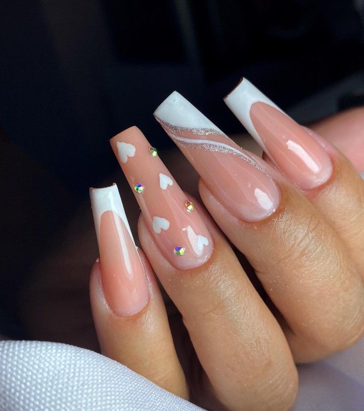 A modern twist on the classic french tip, this design features a pale pink base adorned with white heart patterns and silver accents. The minimalist aesthetic makes it both cute and versatile, perfect for casual and formal settings alike.