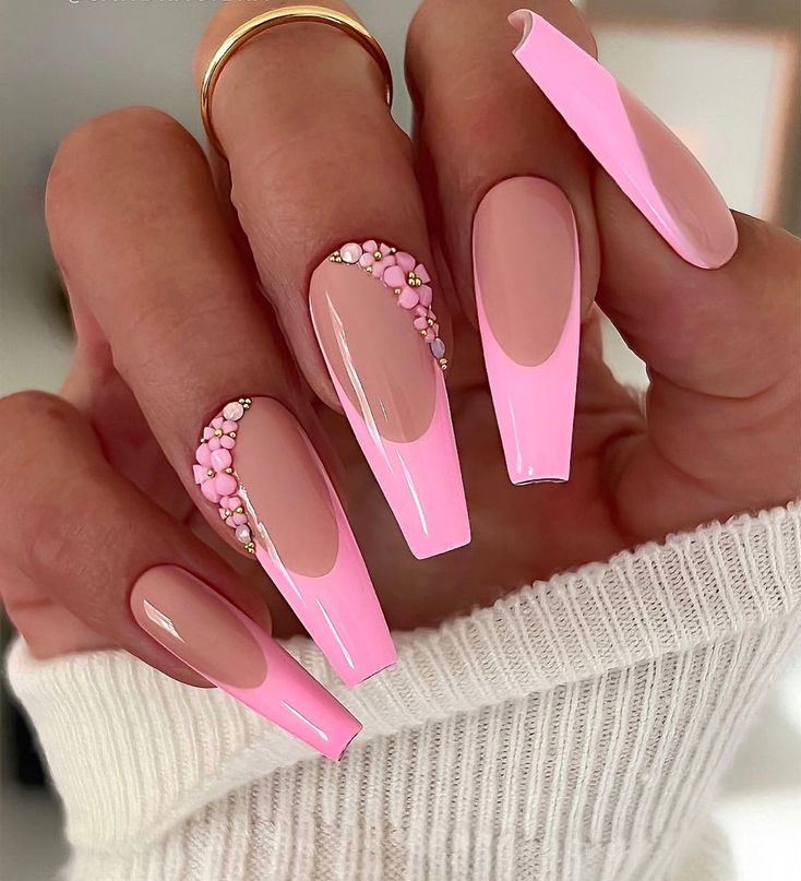 This ultra-glamorous nail set combines bold pink accents with intricate beadwork and floral details. The long acrylic nails are perfect for showcasing the luxurious embellishments, making them a showstopper for spring weddings or elegant events.