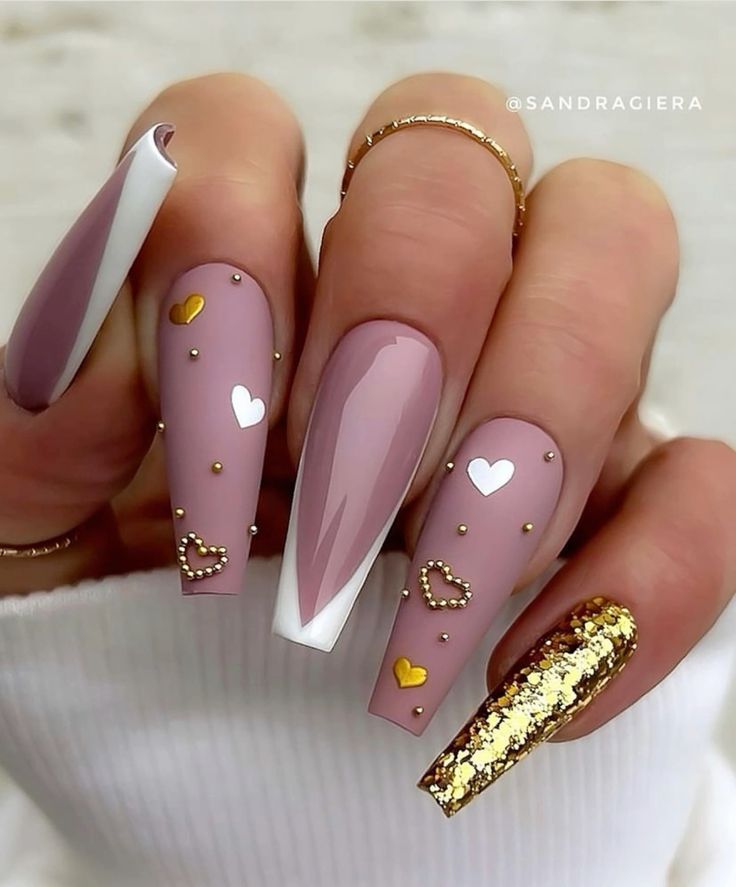 Elevate your manicure game with this stunning acrylic long nail design that features muted mauve tones, gold accents, and heart motifs. The coffin shape enhances the sleek aesthetic, making it ideal for formal springtime soirées or evening events.