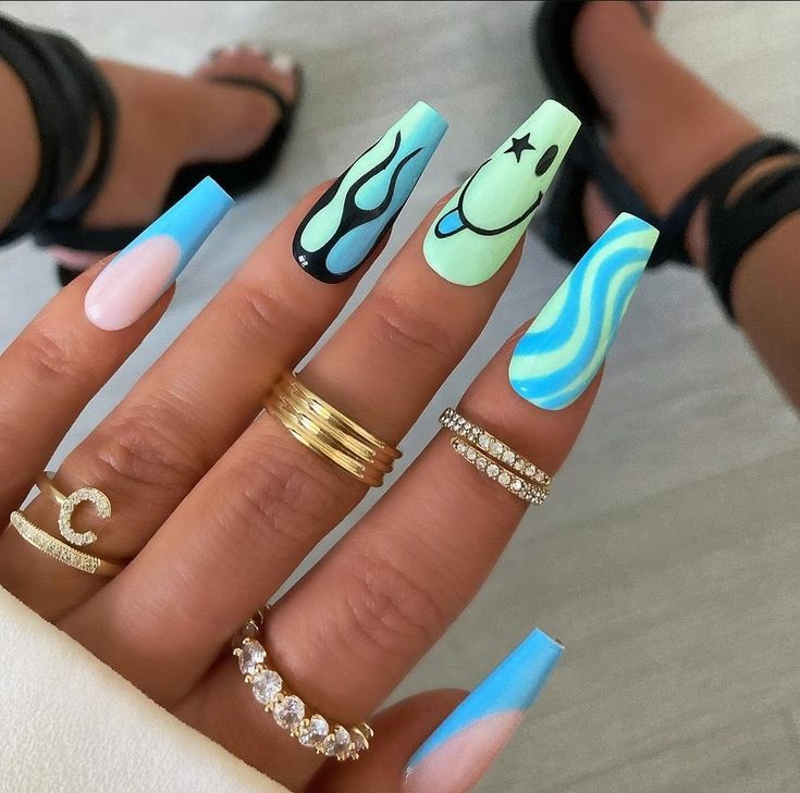For a fun and artistic touch, this design features a blend of mint green, blue, and black swirls, along with a quirky smiley face and flame detailing. This vibrant look is great for expressing individuality and embracing the playful side of spring.