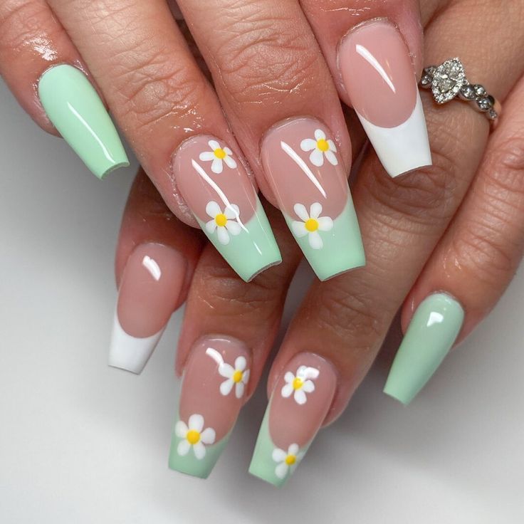 Combining a simple acrylic french tip with delicate daisy patterns, this design brings a touch of whimsy to spring. The mint green tips and clear base create a clean and refreshing look, while the daisies add an adorable charm.
