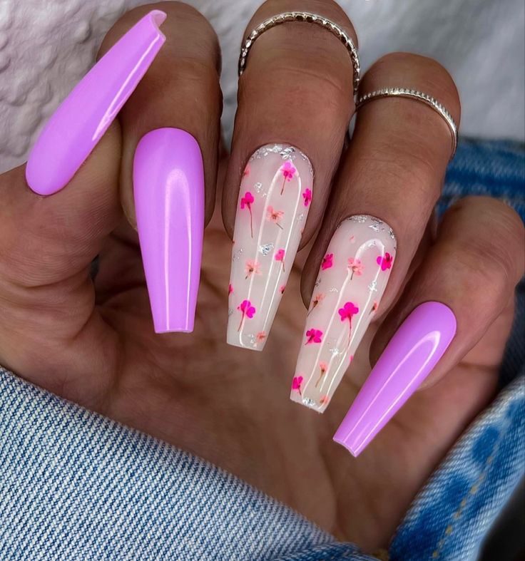 For lovers of purple pastel, this design showcases bold lilac nails paired with clear accents featuring dried floral patterns. The mix of opaque and transparent nails adds dimension and intrigue, making it a perfect choice for spring.