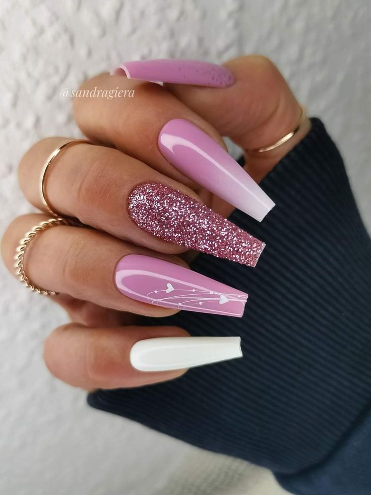 These nails bring together pink acrylic shades with glittery accents, offering a bold yet cute vibe. The combination of french tip-inspired designs and heart motifs makes them ideal for springtime dates or casual outings. The glitter nail steals the spotlight, adding sparkle to an already playful design.