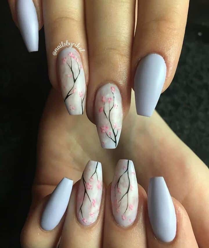 Inspired by blooming cherry blossoms, this design is a celebration of spring. The pale lavender base pairs beautifully with the delicate pink and black tree branches painted across each nail. It’s a medium-length look that feels both serene and stylish.