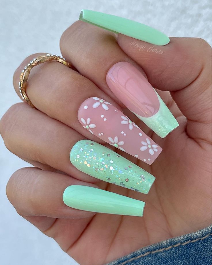 Bright and refreshing, this nail set features a pastel green base with daisy accents and a touch of glitter. The combination of blue and pinkish hues adds a pop of color, making it ideal for casual spring days or vacations.