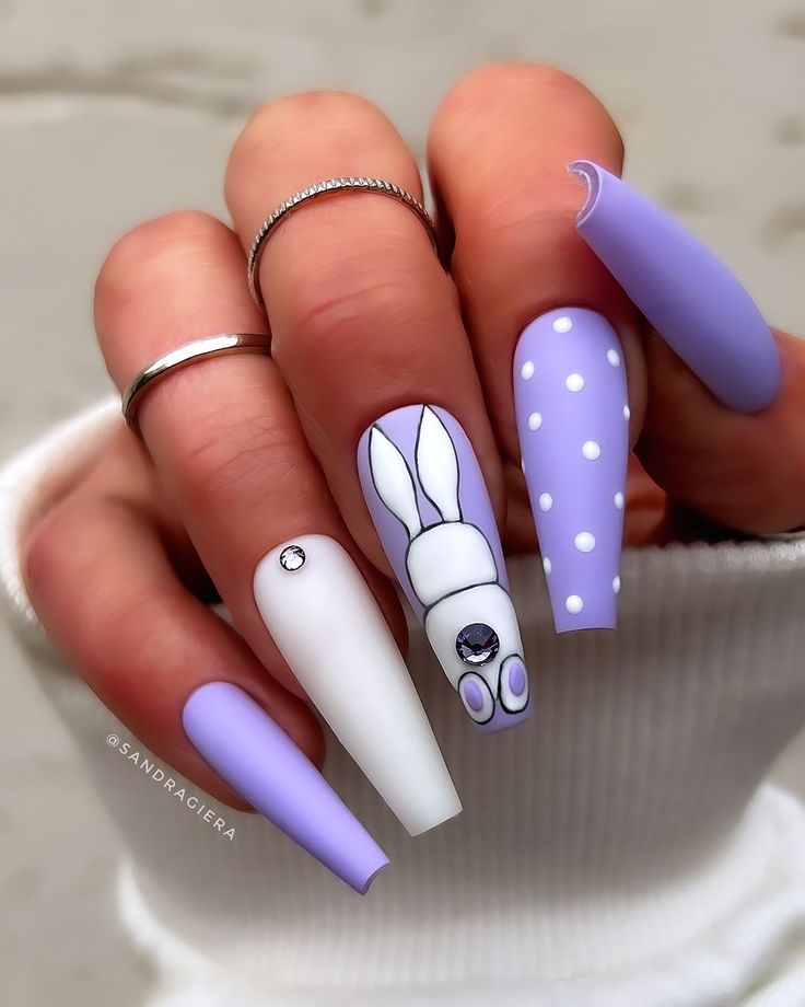 Playful yet elegant, these lavender nails bring together polka dots and a charming bunny illustration. This design is ideal for celebrating Easter or simply adding a quirky twist to your everyday look. The purple pastel tone is both trendy and timeless.
