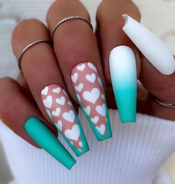 This design blends acrylic ombre with a soft turquoise base and nude tones covered in white hearts. It’s a medium-length style that feels romantic and fresh—perfect for spring engagements or date nights.