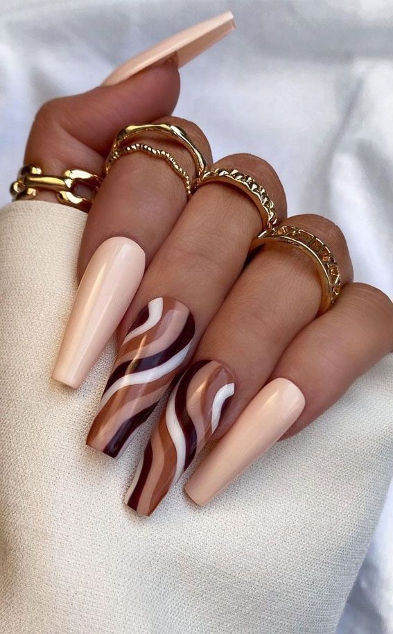 Sophisticated yet playful, these nails feature swirls of nude and chocolate tones. The long acrylic shape adds drama, making them perfect for formal occasions or springtime soirées. This simple design is versatile enough to pair with any outfit.