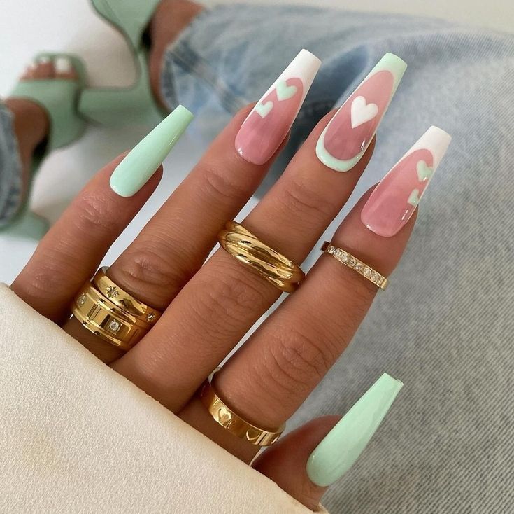 Soft and romantic, this design features pastel green nails paired with pink accents and heart motifs. The long acrylic style makes it ideal for those looking to make a statement. It’s a playful look perfect for casual gatherings or a fun day out.