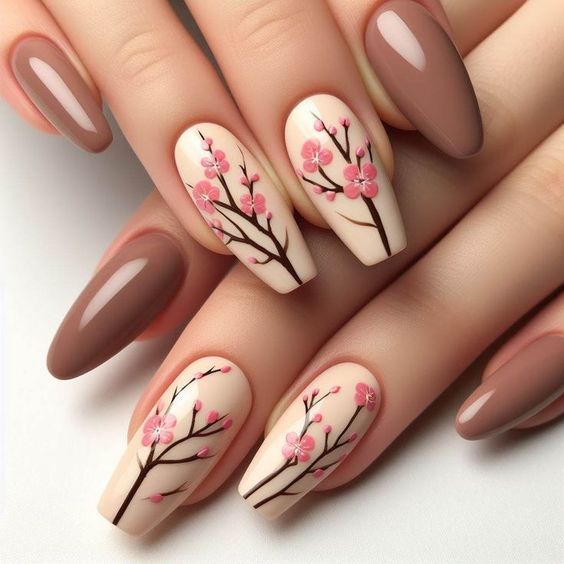 Celebrate the bloom of spring with this stunning cherry blossom-inspired design. A soft beige base serves as the perfect backdrop for delicate pink flowers painted on thin, brown branches. The medium-length acrylic nails highlight the intricate artwork, making it ideal for a feminine, polished look.